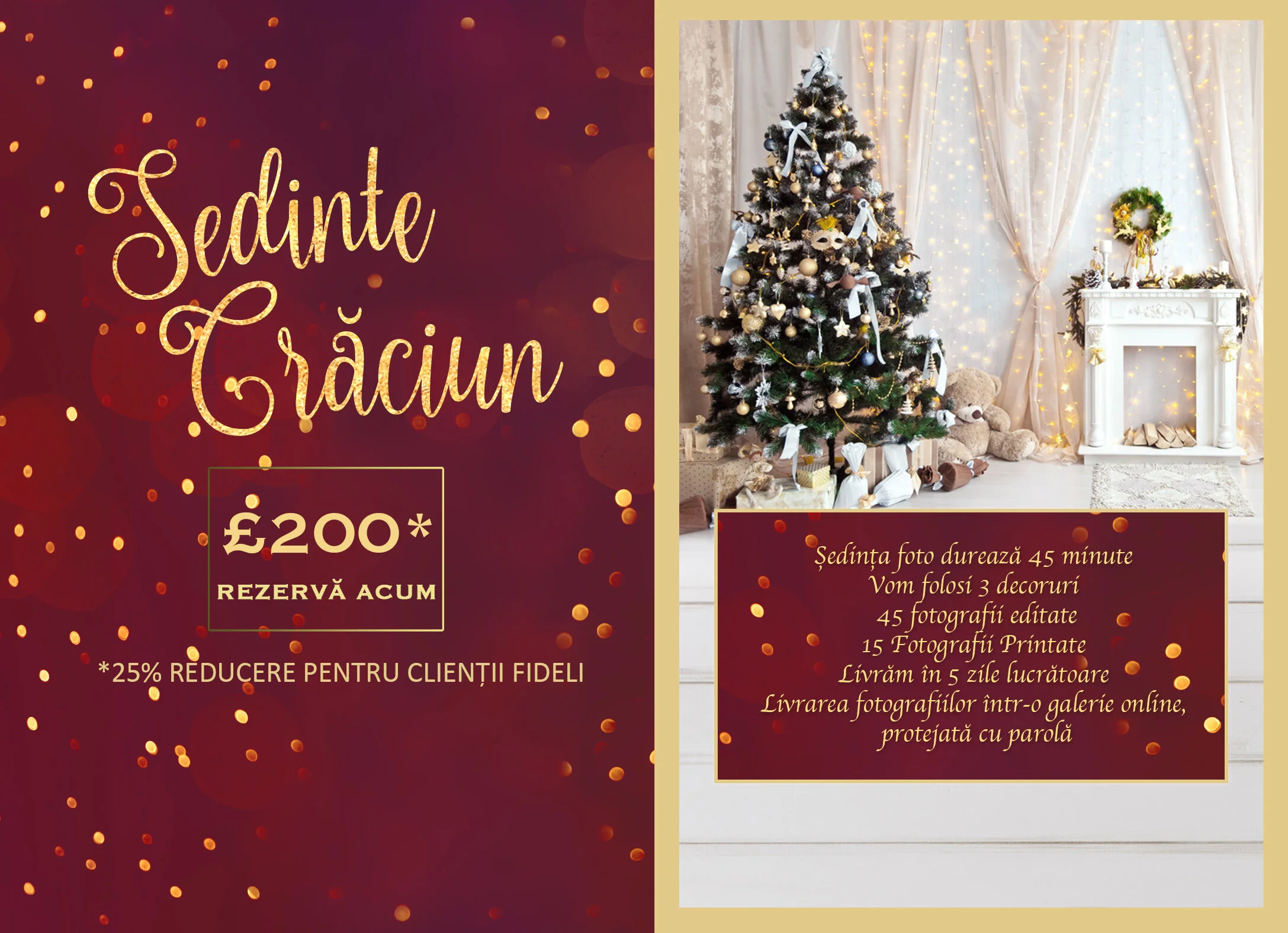 Pentru că știm cât de importantă este această sărbătoare pentru familia ta, ne pregătim deja tolba. O umplem cu lumini, camere foto și obiective și poate chiar și cu câteva globuri, beteală și vâsc pentru bun augur. Putem veni îmbrăcați direct în Moș Crăciun, pentru a spori autenticitatea. Sau, dacă vi se pare prea mult, ne limităm la coarnele de ren sau la căciulițele de spiriduși. Dar mai jos de atât nu negociem!